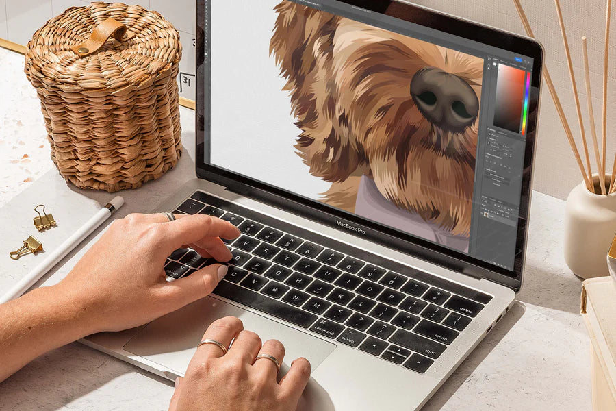 Tai unikalus, rankų darbo kūrinys, sukurtas naudojant profesionalius dizaino įrankius. Mes nenaudojame jokių filtrų ar programėlių – tik tikrą menininko darbą, kuris perteikia jūsų augintinio žavesį.